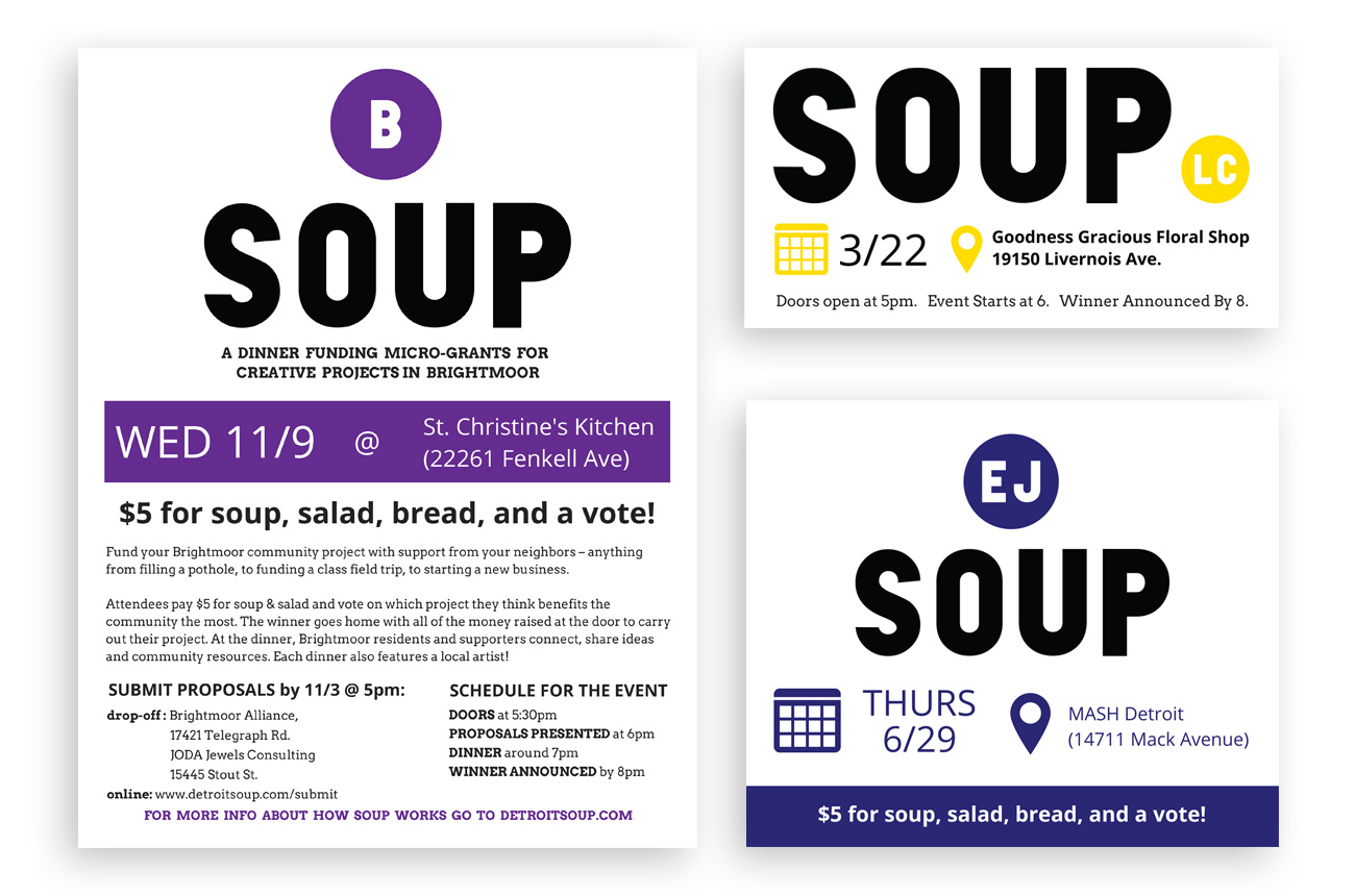 I worked with Detroit SOUP for over three years, first solidifying their brand as they expanded into Detroit's neighborhoods and later creating a book celebrating their fifth anniversary and developing their website which is now maintained by Build Institute..